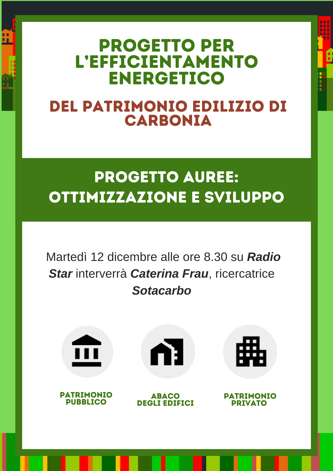 Martedì 12 dicembre, ore 8:30. Il progetto per l’efficientamento energetico del patrimonio edilizio di Carbonia verrà illustrato su Radio Star da Caterina Frau, ricercatrice Sotacarbo.