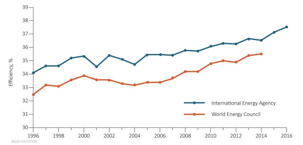 Attualmente, sono funzionanti o in costruzione diversi impianti di gassificazione a ciclo combinato (IGCC) e quasi tutti gli impianti, alimentati a polverino di carbone (PC), con caldaia tradizionale o a letto fluido (FBC) si basano su unità a ciclo Rankine. Nel caso degli impianti con caldaia tradizione e a polverino di carbone si distinguono tre tipi di tecnologie, differenziate a seconda delle condizioni operative del ciclo termodinamico del vapore, che influenzano l’efficienza dell’impianto: cicli a vapore subcritici, supercritici (SC) e ultrasupercritici (USC). Impianti USC recenti a carbone hanno raggiunto rendimenti netti superiori al 47,5% (calcolati a partire dal potere calorifico inferiore del combustibile) e sono disponibili oggi tecnologie in grado di garantire efficienze superiori al 49% (è il caso dell’impianto Pingshan II, in Cina). Ciononostante, L’International Energy Agency (IEA) stima che al 2016 l’efficienza media del parco centrali a carbone mondiale sia attorno al 37,5% (Figura 1) con un incremento di 2 punti percentuali rispetto al 2006, di un solo punto percentuale nel decennio 1996-2006 e ben 10 punti percentuali in meno rispetto all'efficienza ottenibile attualmente con le migliori tecnologie. È evidente che a livello mondiale esiste un grosso potenziale di miglioramento dell’efficienza del parco impianti a carbone.