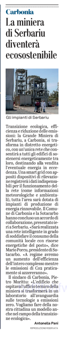A livello comunitario la realizzazione dei distretti energetici da parte delle amministrazioni comunali è uno degli strumenti con maggiori prospettive per raggiungere gli obiettivi di decarbonizzazione. Obiettivo del Comune di Carbonia, attraverso i servizi e le competenze della Sotacarbo, è inserirsi in questo percorso virtuoso di innovazione tecnologica e sostenibilità ambientale. “Un primo esempio di quel che ci proponiamo è il progetto Recover. Una proposta che ci vede impegnati assieme a Sotacarbo, università isolane e altri enti di ricerca internazionali”, spiega il sindaco Morittu. “Si tratta di un progetto di circa 12 milioni di euro, che mira a fare dell’edificio che prima ospitava l’ufficio tecnico della miniera un laboratorio tecnologico d’avanguardia sulle tecnologie a emissioni zero. Con interventi di questo tipo vogliamo fare della nostra cittadina un modello anche nel campo della transizione ecologica”.