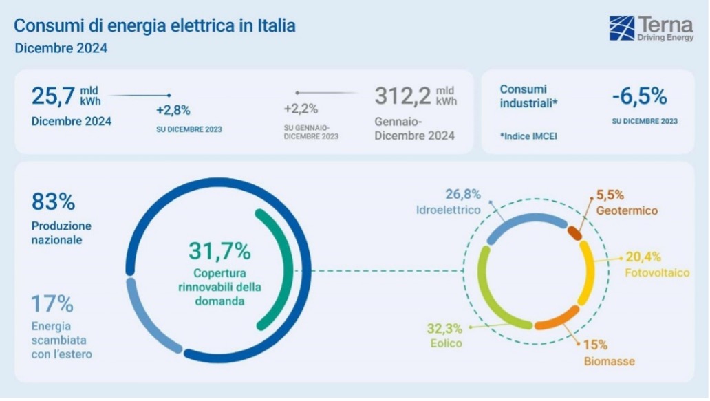 Nel 2024 l’incremento di capacità rinnovabile in Italia è stato di 7.480 MW, 1.685 MW in più rispetto al 2023 (+29%). A fine dicembre il nostro paese ha registrato 76,6 GW di potenza installata da fonti rinnovabili, di cui 37,1 GW di solare e 13 GW di eolico.