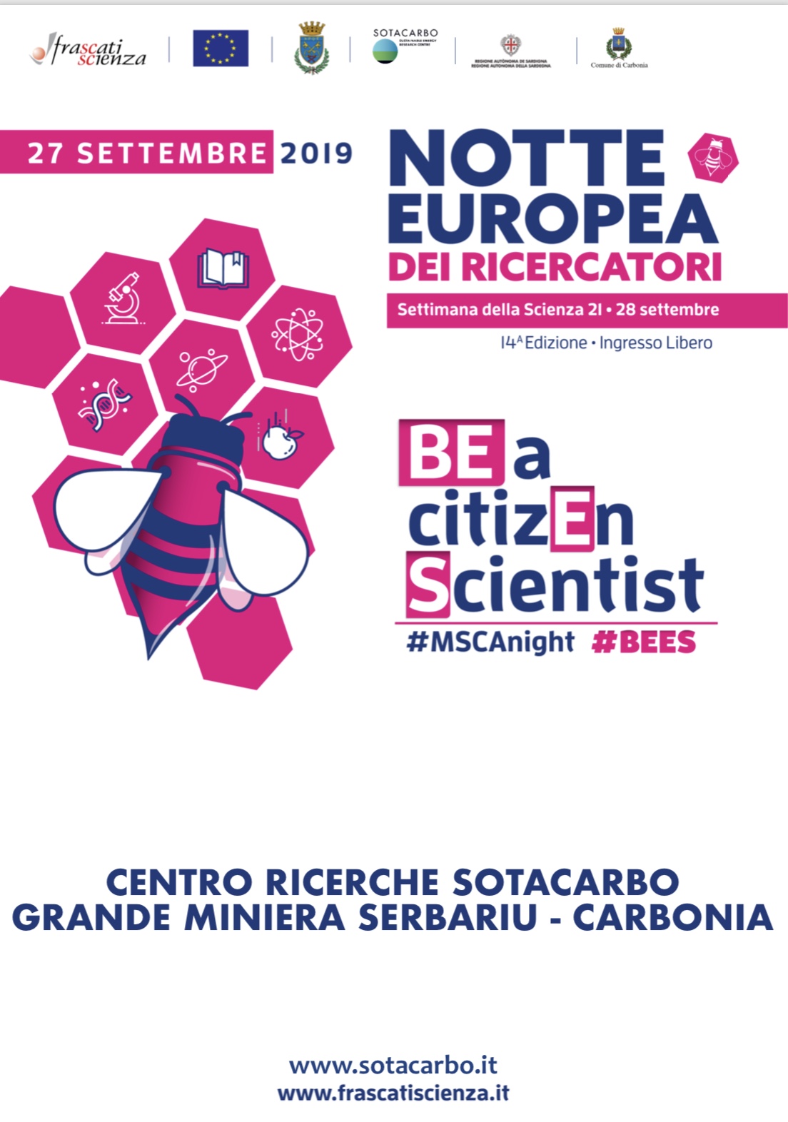 Si rinnova l'appuntamento annuale con la Notte Europea dei Ricercatori, l'evento scientifico divulgativo promosso dalla Commissione Europea, coordinato in Italia da Frascati Scienza. Saranno oltre 400 gli eventi proposti nella settimana che va dal 21 al 28 settembre. Da tradizione il venerdì è la giornata clou del programma. Come lo scorso anno, obiettivo dichiarato dell'iniziativa Sotacarbo sarà quello di coinvolgere i cittadini interessandoli e avvicinandoli alla ricerca scientifica, in un contesto informale e stimolante.