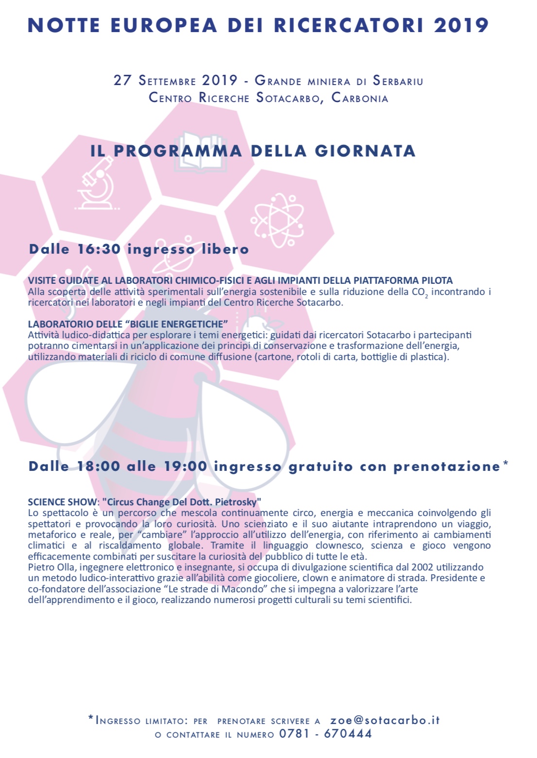 Sotacarbo, col patrocinio del Comune di Carbonia e della Regione Autonoma della Sardegna, anche quest'anno apre al pubblico il proprio Centro Ricerche. Venerdì 27 settembre, a partire dalle 16.30, sarà possibile visitare i laboratori e gli impianti e partecipare al laboratorio delle "Biglie energetiche" per giocare con l'energia e le sue trasformazioni. Alle ore 18 nell'auditorium accoglierà lo spettacolo proposto da Pietro Olla, ingegnere, insegnante e giocoliere che con "Circus Change del Dott. Pietrosky" coinvolgerà i partecipanti in uno spettacolo che mescola continuamente scienza, circo ed energia. Per quest'ultimo evento è consigliabile la prenotazione allo 0781/670444 o all'indirizzo zoe@sotacarbo.it.