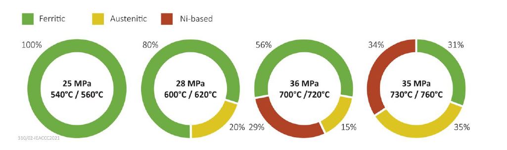 La temperatura e la pressione di esercizio delle attuali centrali elettriche "Usc" sono limitate dalla cosiddetta barriera dell'acciaio, il limite oltre il quale questi materiali non possono più essere utilizzati in sicurezza. Per aumentare i parametri del vapore bisogna adottare nuovi materiali e utilizzare in maniera innovativa i materiali esistenti. Questi includono acciai martensitici e austenitici avanzati e leghe a base di nichel, che devono resistere a corrosione, erosione, ossidazione da vapore, sollecitazioni termiche e meccaniche, oltre ad essere testati in modo intensivo e certificati. Maggiore è la temperatura dell'impianto operativo, maggiore è la quantità di materiali avanzati richiesta, come mostrato in Figura 1.