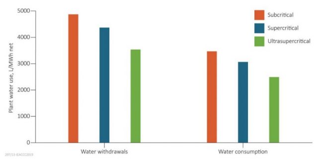 [caption id="attachment_11711" align="alignnone" width="640"] Figura 2. Acqua complessivamente impiegata nelle tecnologie subcritiche, supercritiche e ultrasupercritiche[/caption]Prendendo come esempio una unità da 500 MW a ciclo subcritico, questa richiede approssimativamente 5000 litri di acqua, con 3500 litri di acqua consumata per MWh prodotto. Una simile unità con tecnologia supercritica consumerebbe 3000 litri, con tecnologia ultrasupercritica ne consumerebbe invece 2300.