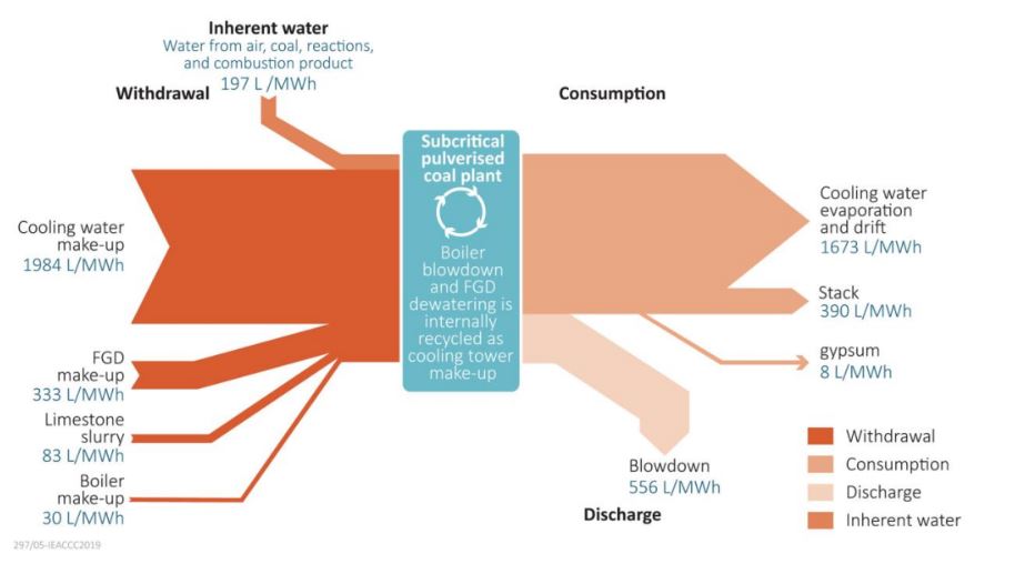 Il principale consumo di acqua, all'interno di una centrale a carbone, è attribuibile al sistema di raffreddamento, sebbene esistano diversi processi che contribuiscono in maniera minoritaria. Come desumibile dalla figura 1, l’acqua di raffreddamento contribuisce per circa il 75% del totale. L’acqua per la rimozione della SO2 dal gas di scarico è responsabile di circa il 16%, che può diminuire sino al 13%; quella necessaria alla produzione dello slurry di calcare per la cattura della SO2 ammonta a circa il 3% del totale. L’acqua in caldaia ammonta all'1% e circa il 7% deriva dalla combustione dell’aria e dalle reazioni chimiche durante la combustione. Gli impianti a carbone generano grandi quantità di acque reflue contenenti inquinanti che, se riversate senza alcun trattamento nei corsi d’acqua, possono causare seri problemi alla popolazione e all'ambiente circostante. Metalli tossici quali mercurio, selenio e piombo, derivanti dalle ceneri prodotte in seguito alla combustione, possono accumularsi nel cibo e nelle acqua potabili.