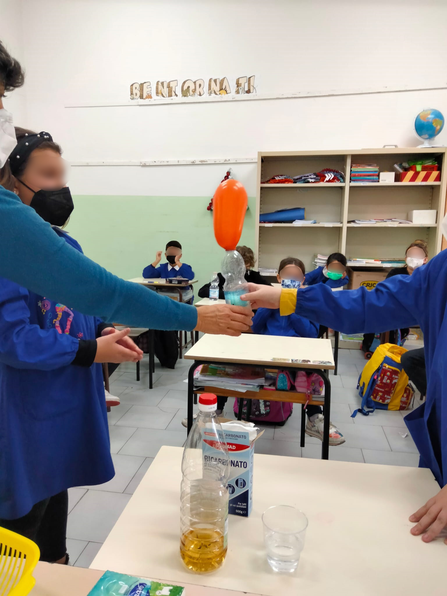 Per farlo, gli alunni si sono cimentati con esperimenti come la produzione dell'anidride carbonica dalla reazione tra bicarbonato di sodio e aceto (per gonfiare un palloncino) o la "creazione" della molecola di CO2 dall'incontro dei singoli atomi, ciascuno rappresentato da un bambino.