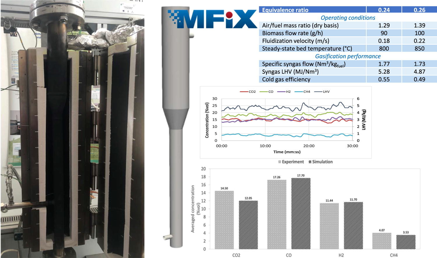 This paper presents the results of a combined experimental and computational characterization of a biomass gasification process as a carbon neutral technology for power generation and/or green hydrogen production. With the aim to set and validate a computational fluid dynamic (CFD) multiphase flow simulation model based on the MFiX suite – as a support for the design and optimization of advanced reactors for energy purposes – a wide experimental campaign has been carried out with cypress (Cupressus sempervirens) wood chips in a lab-scale bubbling fluidized-bed gasification unit in different operation modes: pyrolysis, air-blown gasification as well as steam gasification of char. In addition, pyrolysis kinetics have been experimentally assessed by thermogravimetric analysis (TGA). This study shows that biomass pyrolysis is characterized by a syngas yield of 0.65–0.66, whereas its gasification allows the production of a syngas (1.73–1.77 Nm3 per kilogram of fuel) characterized by a lower heating value of about 5 MJ/Nm3, with a hydrogen concentration between 11.4 and 14.3% by volume (depending on the equivalence ratio). In addition, model used is a good predictive tool that can successfully simulate the process and predict syngas composition with good accuracy, in particular for CO, H2 and CH4.