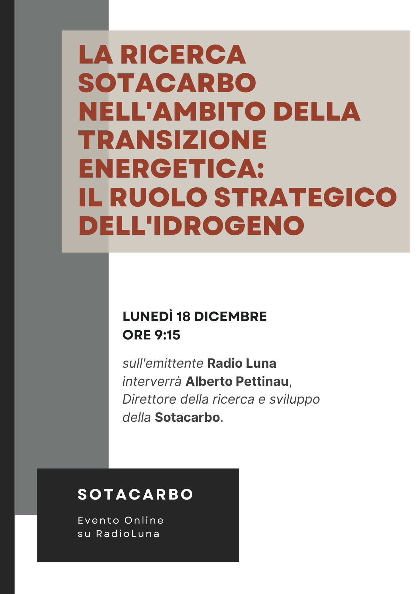 L'attività di Sotacarbo nell'ambito della transizione energetica e il ruolo strategico dell'idrogeno saranno al centro dell'intervista che lunedì 18 dicembre, alle ore 9.15, sarà trasmessa in diretta da RadioLuna. Ai microfoni Alberto Pettinau, Direttore di Ricerca e Sviluppo Sotacarbo, che presenterà le attività che la nostra società sta sviluppando nell'ambito del Progetto Triennale di Realizzazione 2022-2024 sulla Ricerca di Sistema Elettrico Nazionale.