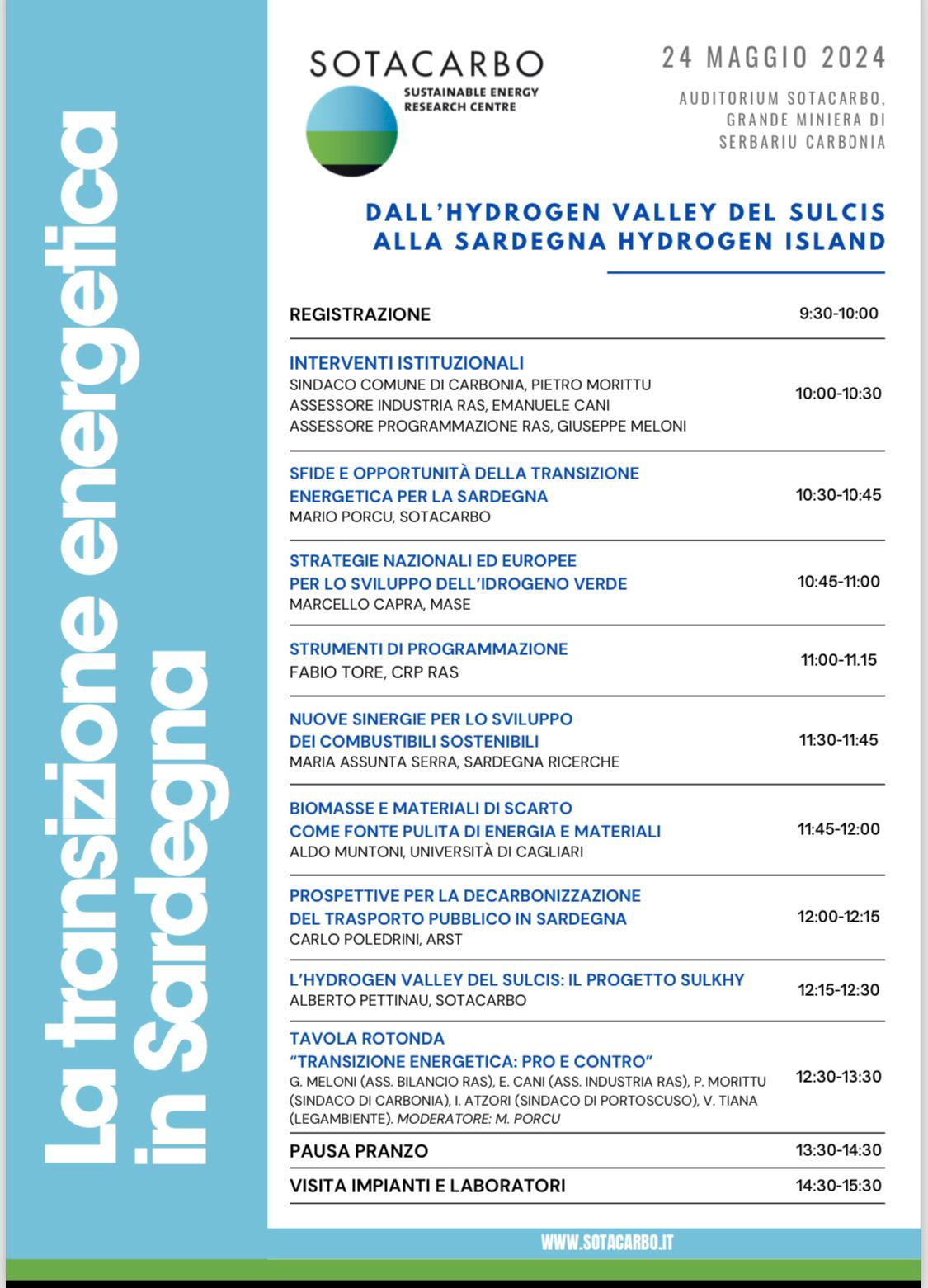 Seconda edizione del workshop sulla transizione energetica in Sardegna dal titolo "Dall'Hydrogen Valley del Sulcis alla Sardegna Hydrogen Island". Un incontro per fare il punto sui progetti attuali e futuri nel campo dell'idrogeno e della transizione energetica. Venerdì, 24 maggio 2024 dalle 9.30 presso il Centro Ricerche Sotacarbo, Grande Miniera Serbariu, Carbonia.