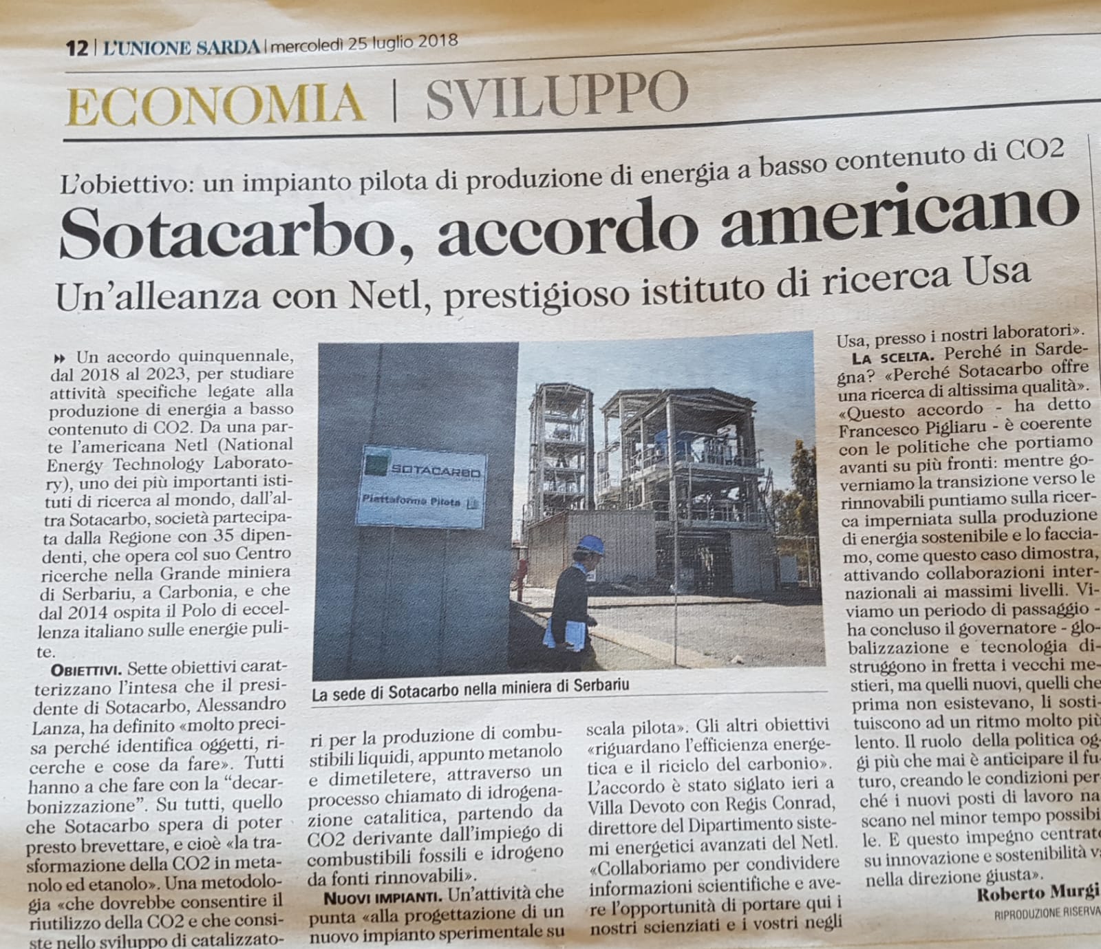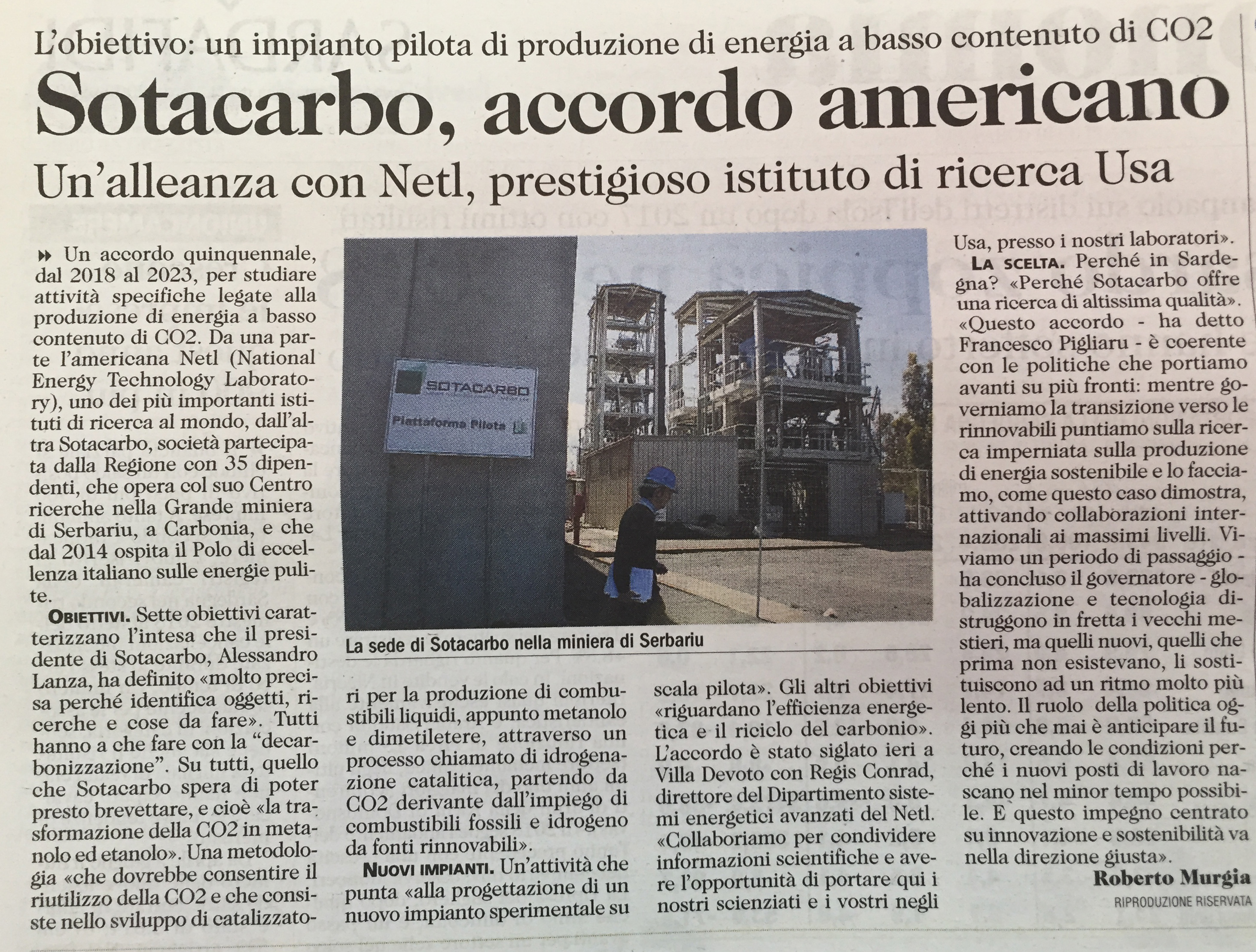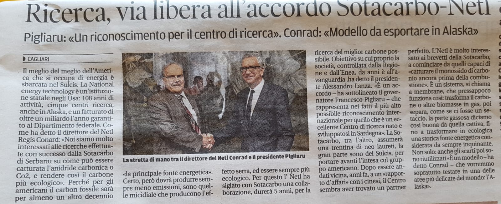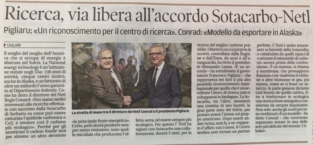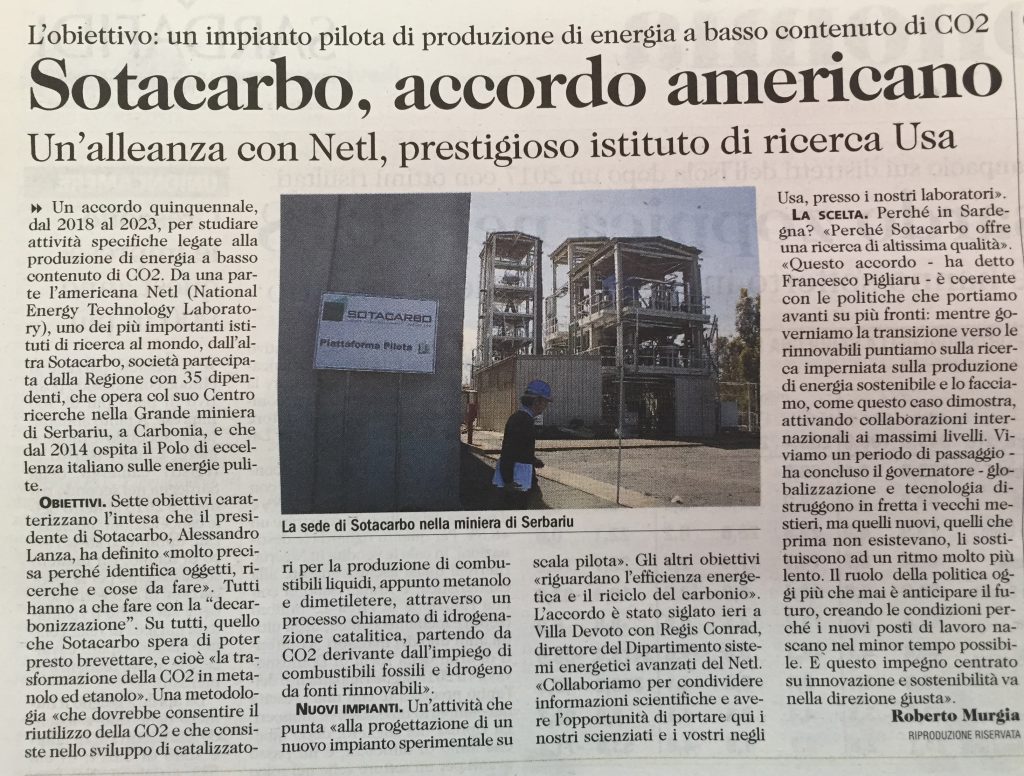 Rassegna stampa RAI News - TGR Sardegna (24.07.2018) (VIDEO) Sotacarbo, ricerche sull'energia TCS News (24.07.2018) (VIDEO) Serbariu rinasce grazie agli americani Videolina (24.07.2018) (VIDEO) Energia pulita, Sotacarbo nei circuiti mondiali: intesa a stelle e strisce ANSA (24.07.2018) Energia pulita, asse Sardegna-Usa Accordo Netl-Sotacarbo per rilancio polo ricerca a Serbariu Cagliari Post (24.07.2018) Sotacarbo e NETL, accordo di cinque anni per ricerca e sviluppo Libero (24.07.2018) Ricerca, accordo quinquennale Sotacarbo-Netl. Pigliaru: collaborazione ai massimi livelli per innovazione e sostenibilità Alguer.it (24.07.2018) Ricerca: accordo quinquennale Sotacarbo-Netl Regione Autonoma Sardegna (24.07.2018) (VIDEO) Ricerca, accordo quinquennale Sotacarbo-Netl. Pigliaru: collaborazione ai massimi livelli per innovazione e sostenibilità ENEA (26.07.2018) Energia: accordo tra Sotacarbo e statunitense NETL per un futuro carbon free Nuova Sardegna (25.07.2018) La Nuova Sardegna Unione Sarda (25.07.2018) L'Unione SardaUltimo aggiornamento