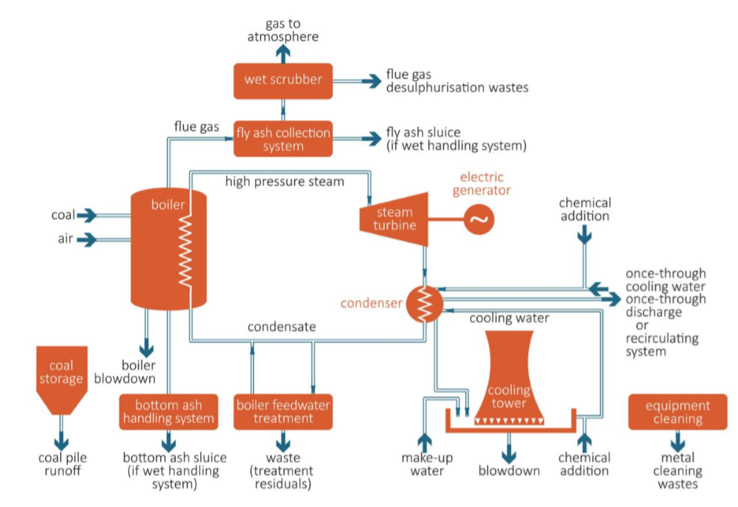 Il tipo e la quantità delle acque reflue da trattare sono condizionate dalla legislazione e dai requisiti di autorizzazione dell'impianto. Gli scarichi di una centrale sono molteplici e di varia natura, cosi come mostrato nella figura seguente in riferimento ad una centrale elettrica a carbone con raffreddamento ad acqua. Le correnti variano in quantità, caratteristiche e portate, e possono essere intermittenti o continue. Inoltre, la composizione delle acqua di scarico può variare al variare del tipo di combustibile. Ulteriori correnti sono introdotte a seguito dell’obbligo di adottare sistemi di controllo per l’inquinamento dell’aria cosi come imposto dalla legislazione nuova o più restrittiva. Questo è ciò che accade in India dove sono stati introdotti nuovi limiti sulle emissioni di biossido di zolfo. Il sistema di trattamento deve essere abbastanza flessibile, per adattarsi costantemente a variazioni delle caratteristiche dei flussi in ingresso così da garantire sempre i limiti normativi allo scarico. Ogni impianto ha le sue esigenze particolari, e pertanto la scelta del sistema di trattamento delle acque reflue è specifica del sito. Le acque di scarico con composizione simile vengono miscelate prima del trattamento, mentre altre, come le acque reflue di desolforazione dei gas esausti, vengono di solito trattate separatamente.