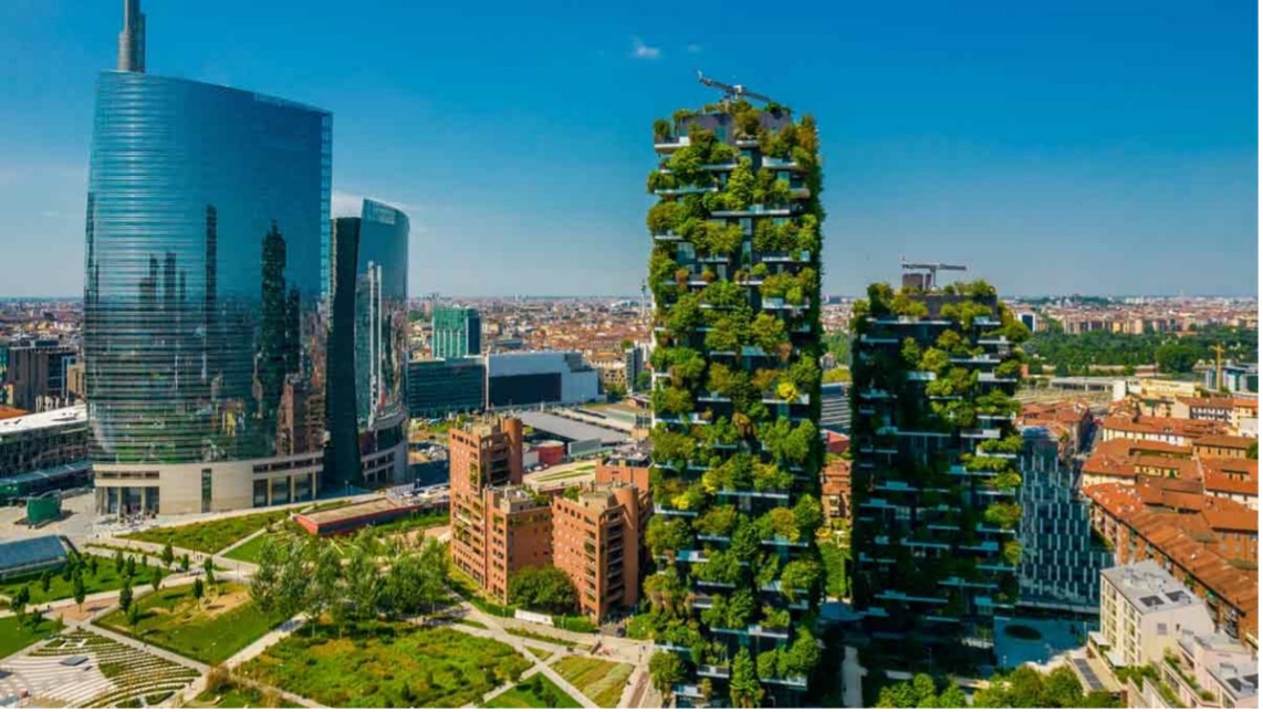 La struttura del Bosco Verticale progettata da Stefano Boeri e conclusa nel 2014, è costituita da due torri (una alta circa 110-112 metri - 24 piani, l’altra circa 76-80 metri - 17 piani) che ospitano in totale 113 appartamenti. La peculiarità di quest’edificio è la presenza di oltre 800 alberi di diverse specie sui balconi della struttura che creano un microclima, oltre ad avere una funzione decorativa, consentendo di ridurre i consumi energetici all’interno degli appartamenti. La presenza della vegetazione riduce le quantità di anidride carbonica e polveri sottili nell’aria e negli anni ha attirato migliaia di esemplari di volatili e farfalle, ripopolando la fauna della città.