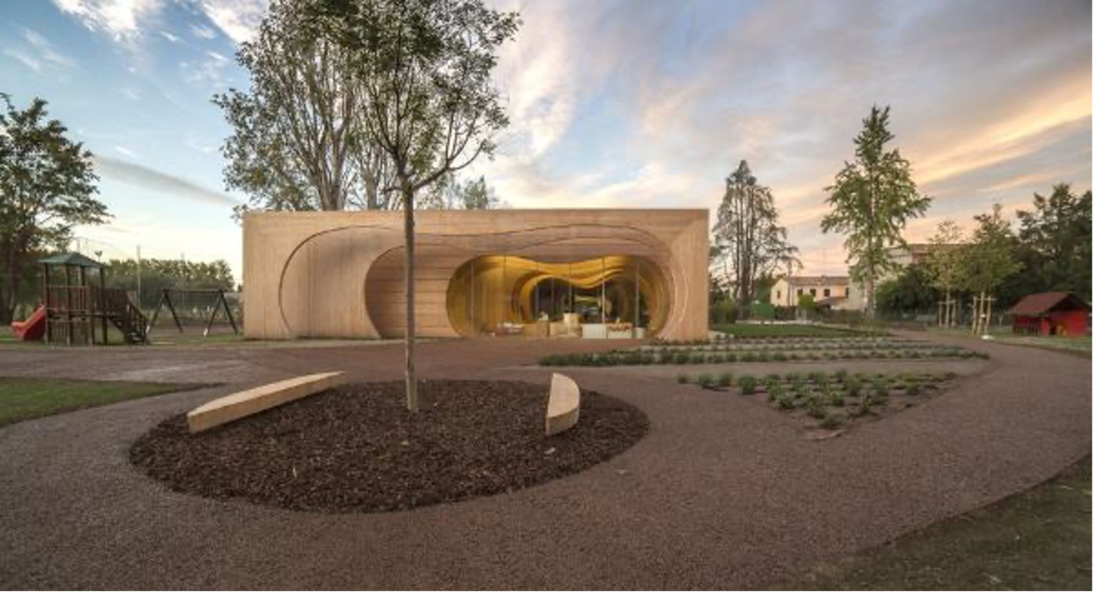 L’asilo nido La Balena a Reggio Emilia è stato interamente costruito con materiali sostenibili, principalmente vetro e legno, ad eccezione delle fondazioni in cemento. Il suo nome prende ispirazione dalla favola di Pinocchio. Altre caratteristiche che rendono l’edificio ecologico sono date da un sistema di riciclo dell’acqua piovana, un basso consumo energetico e un impianto fotovoltaico per la produzione di energia.