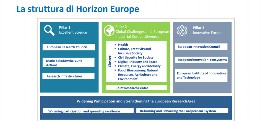 Horizon Europe rappresenta un'evoluzione del precedente programma quadro, con molti elementi di continuità ma anche diverse novità, soprattutto relative al terzo pilastro. La struttura ricorda appunto quella dell’Horizon 2020: tre pilastri, azioni e interventi trasversali.