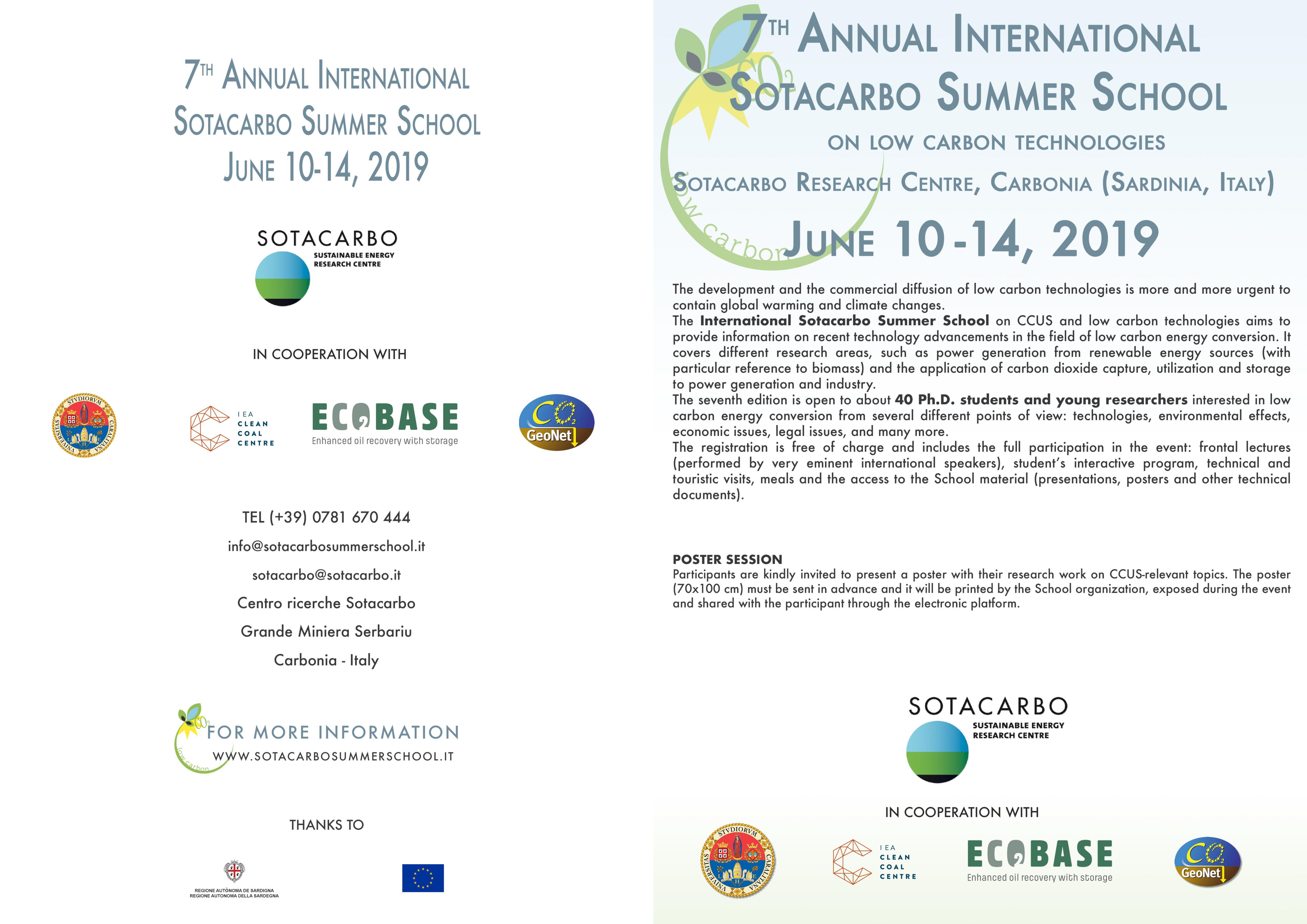 La International Sotacarbo Summer School on CCUS and low carbon technologies informa la comunità scientifica e condivide i più recenti sviluppi tecnologici nel settore dei processi di conversione energetica a basse emissioni di CO2. Vengono prese in esame diverse aree di ricerca, come ad esempio la produzione di energia da fonti rinnovabili (biomassa) e l’applicazione della cattura, riutilizzo e stoccaggio della CO2 sia nel settore della generazione di potenza che nel settore industriale.