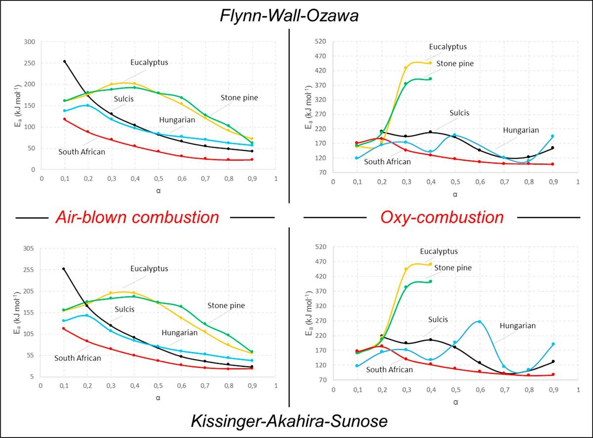 This paper reports on the results of air-blown combustion and oxy-combustion kinetic characterization (comparing two different isoconversional methods: Flynn-Wall-Ozawa and Kissinger-Akahira-Sunose) of different kinds of coal (from Italy, South Africa and Hungary) and biomass (pine and eucalyptus chips) by thermogravimetric analysis (TGA) and differential scanning calorimeter (DSC) together with the assessment of different characteristic combustion parameters. It can be observed that the burning rate of fuels can be improved by the oxy-combustion process, shortening the burning time (a mean reduction of the burnout time of 14% and 22% can be observed for coal and biomass samples, respectively). Moreover, biomass shows better ignition performance than coal and enhances combustibility indexes (S and Hf), especially in oxy-combustion conditions. For example, the S index, which reflects combustion properties, increases by an order of magnitude for biomass combustion and oxy-combustion with respect to coal values, thus indicating a higher combustion activity for biomass; an opposite trend can be observed for the Hf index, which describes the rate and intensity of the process and is lower for biomass than for coal, thus indicating better performance for wood chips combustion. Kinetic analysis shows that the activation energy Ea varies with conversion values, reflecting the kinetic complexity in both the processes. Moreover, with the same range of heating rates (10 ≤ β ≤ 50 °C/min) and for the overall range of conversion (0.1 ≤ α ≤ 0.9), both of the models used fit the experimental data in combustion regime, whereas the increase of the oxygen concentration makes the results reliable for coal samples and more sensitive to weight loss for biomass samples.
