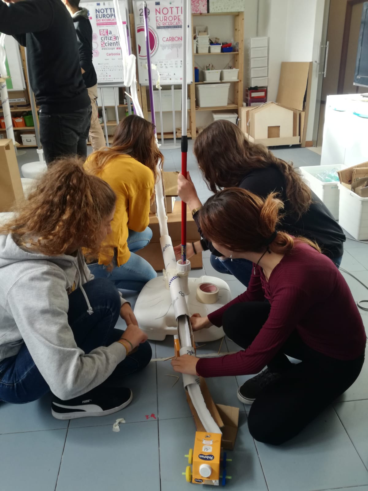 Gli studenti vengono coinvolti in una competizione a squadre che permette loro di dare sfogo alla loro creatività e fantasia, utilizzando i materiali a disposizione, tra cui tubi di carta, tubo isolante, nastro carta, stecchini e aste di legno, biglie di vari materiali e dimensioni, brik di latte, colla a caldo.